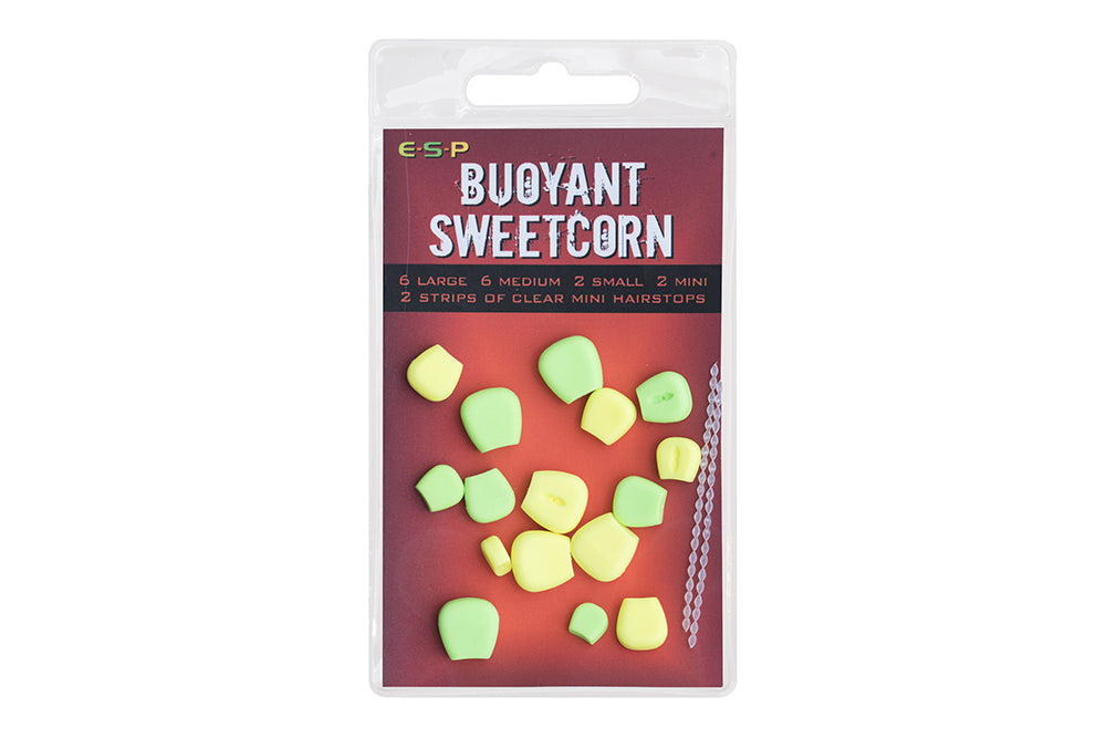 - ESP sweetcorn is perfect for a wide variety of presentations from balancing or tipping boilies or nuts, to creating the perfect pop up. The larger sizes are also ideal for zig rigs. The vibrant ‘nature identical’ yellow colour provides excellent visual attraction whilst the creamy sweetcorn flavour impregnated during the moulding process offers an attractive scent.